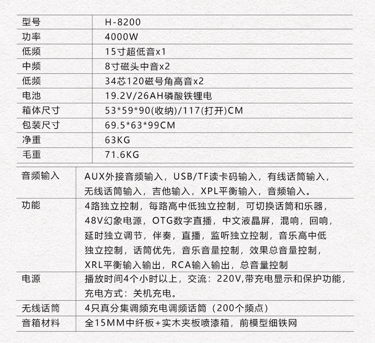 内置19.2V26AH磷酸铁锂电池,播放时间4个小时以上