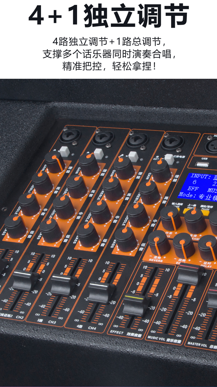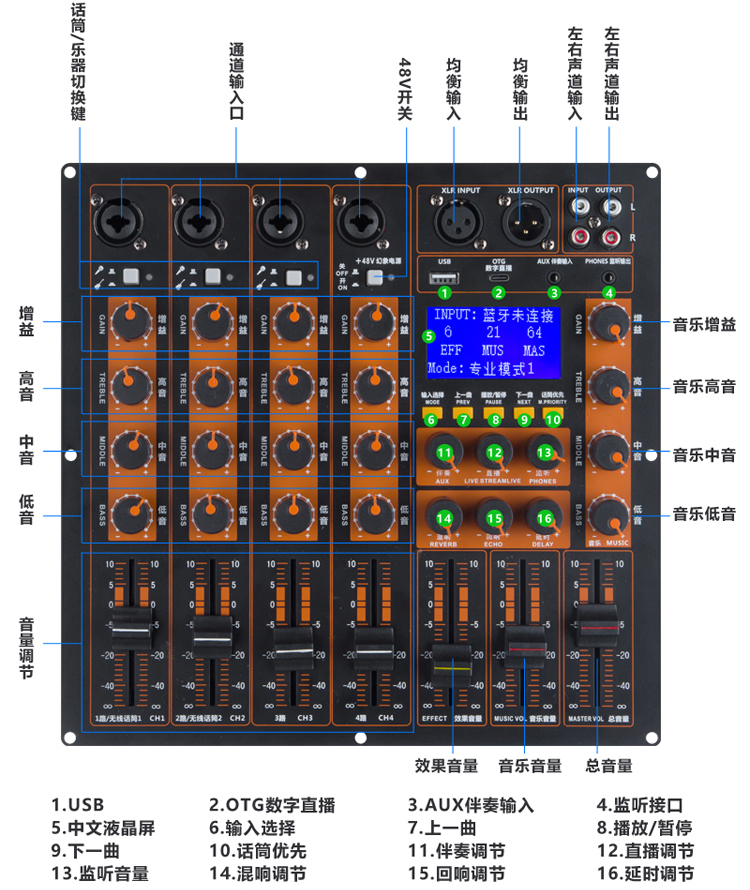 4路独立控制,每路高中低独立控制,可切换话筒和乐器,48V幻象电源,OTG数字直播,中文液晶屏,混响,回响,延时独立调节,伴奏,直播,监听独立控制,音乐高中低独立控制,话筒优先,音乐音量控制,效果总音量控制,XLR平衡输入输出,RCA输入输出,总音量控制